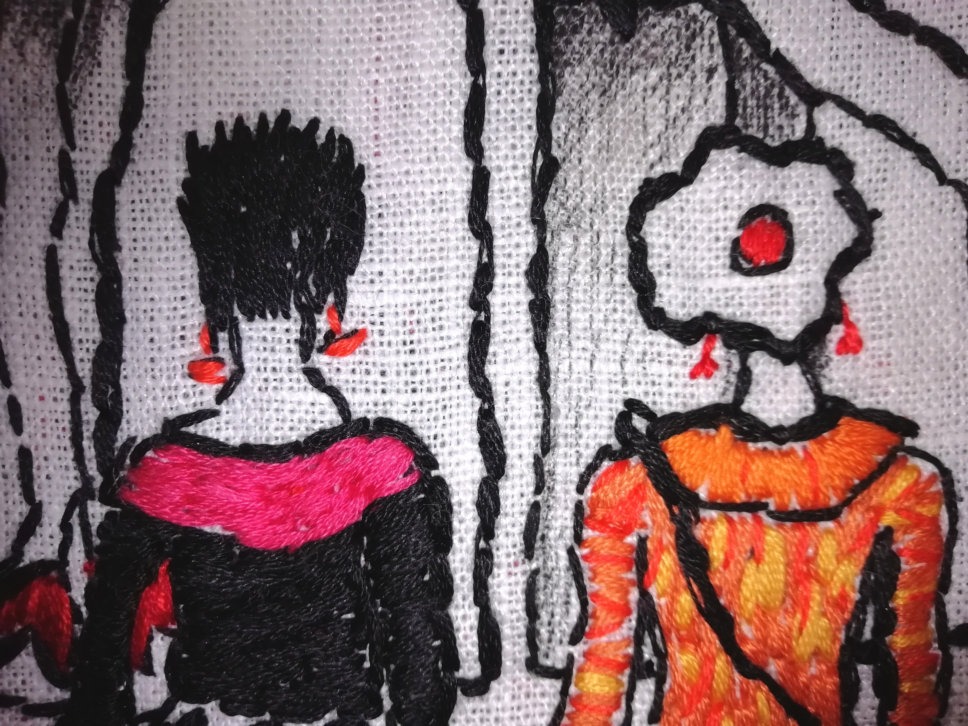 25 x 35 cm, © 2021, niet te koopRuimtelijk | Beelden | Textiel borduurwerk gebaseerd op mijn getekende dagboek, in de serie sweet memories ter nagedachtenis van mijn in 2020 overleden hartsvriendin